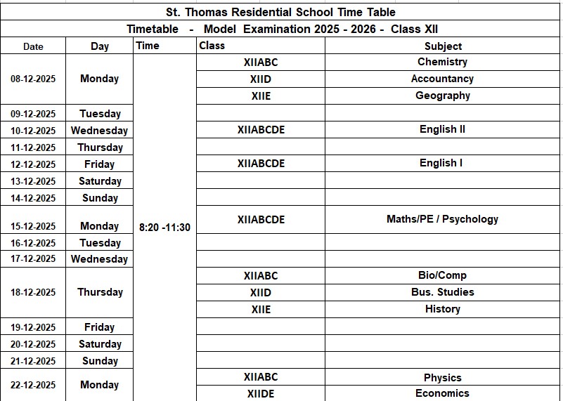Class X & XII Model Exam Timetable